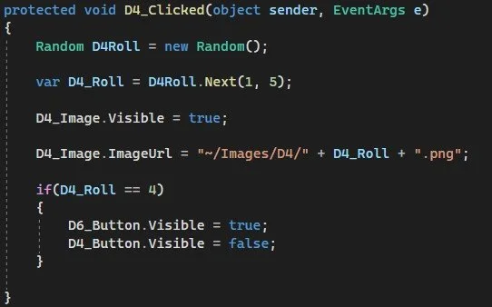 I chose to use individual images for each face because I wanted to make sure that the numbers would be placed like they are on a real dice. If I were going to optimize this project, I would most likely use the blank die image as a label background, and use ‘Label.Text = D4_Roll;’.