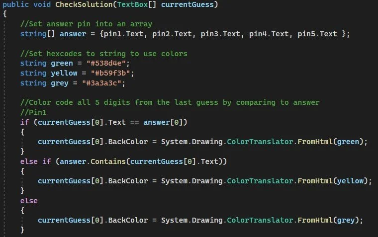 The “CheckSolution” function color codes the user’s guess numbers. It checks each digit for placement (green), then appearance in the pin (yellow), or if it is missing (gray).
